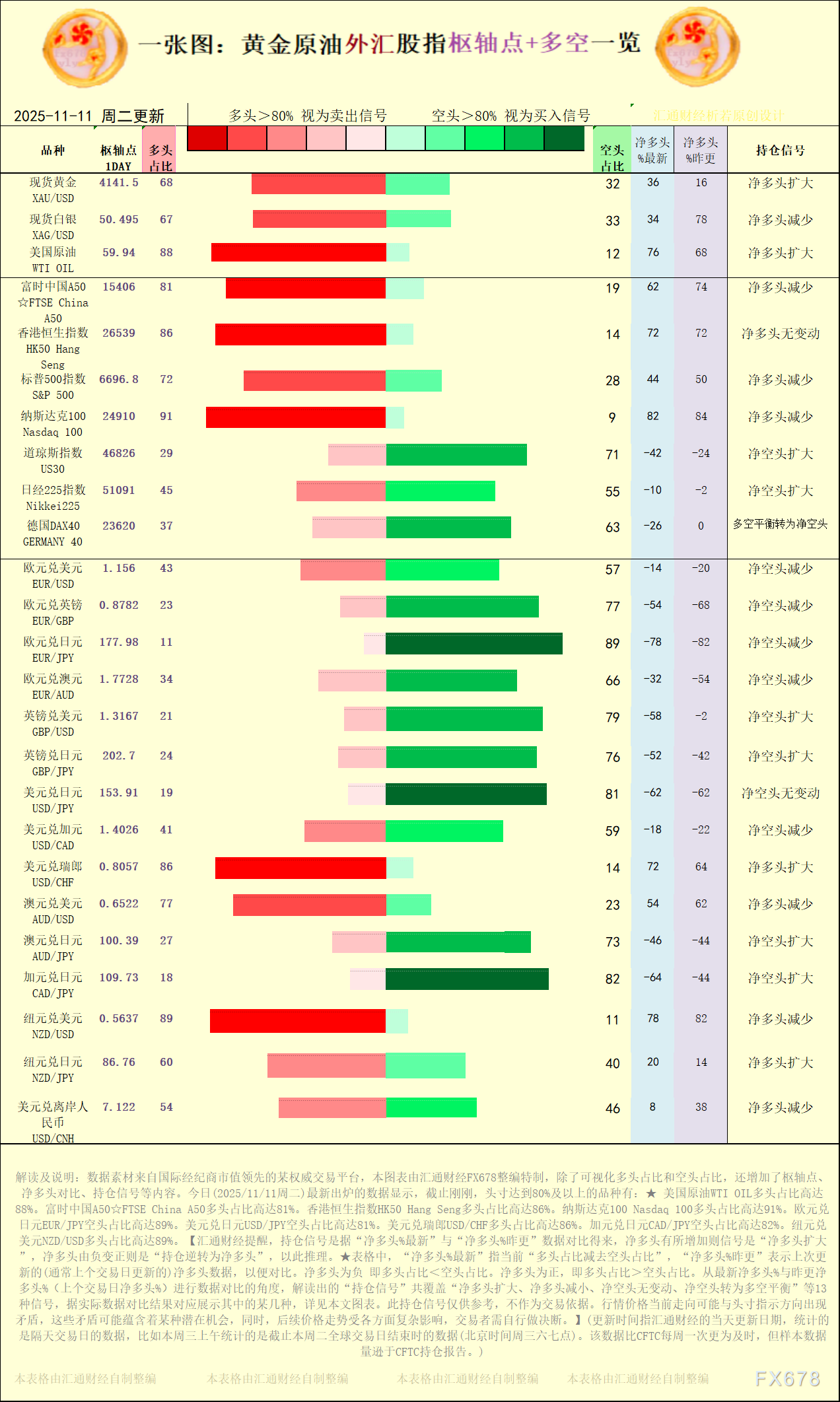 exness外汇官网:一张图:2025/11/11黄金原油外汇股指“枢纽点+多空持仓信号”一览