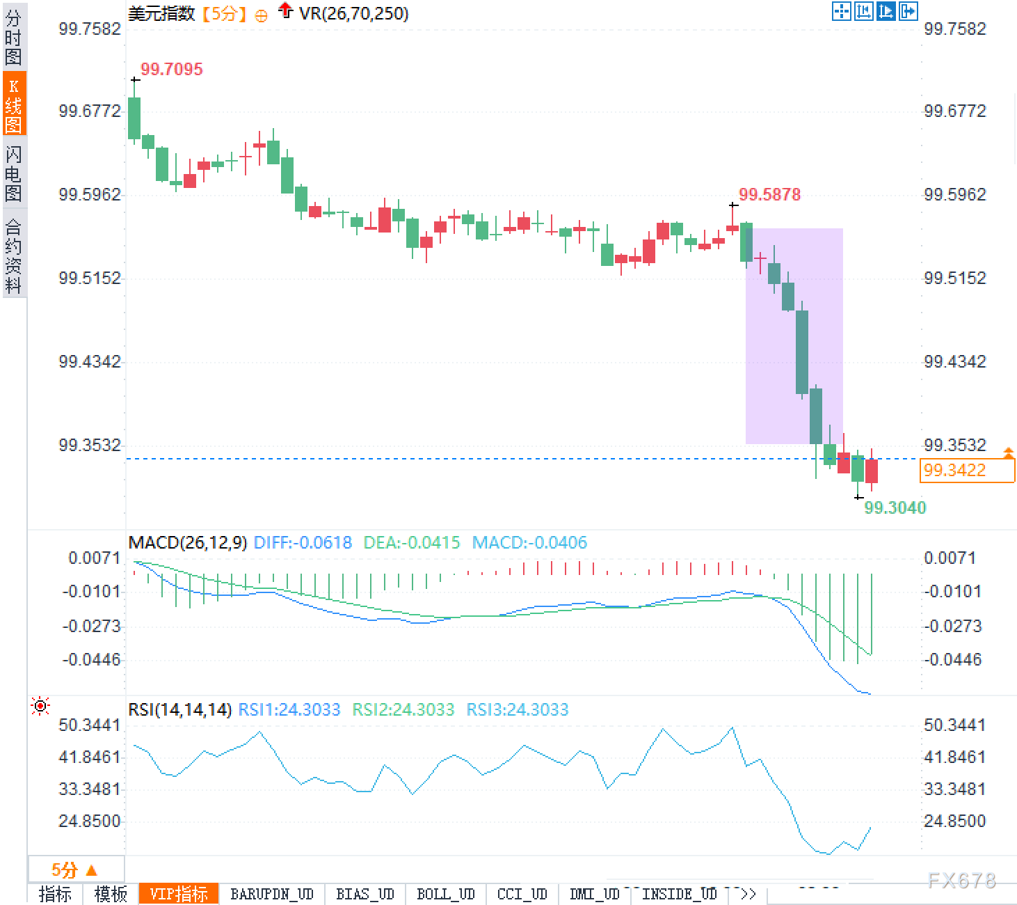 从5分钟K线图观察,美元指数在99.5878附近形成最后一波反弹高点后,出现一段显著的加速下跌区间(图中紫色矩形),连续多根实体阴线放量下压,并在破位后出现弱势回抽未果的“支撑转阻力”特征。MACD显示DIFF -0.0618、DEA -0.0415、MACD柱状图-0.0406,零轴下方进一步走阔,呈现标准的动能扩大信号;RSI在24.3033附近,位于传统的30之下,已触发“超卖但未见拐点”的状态。
